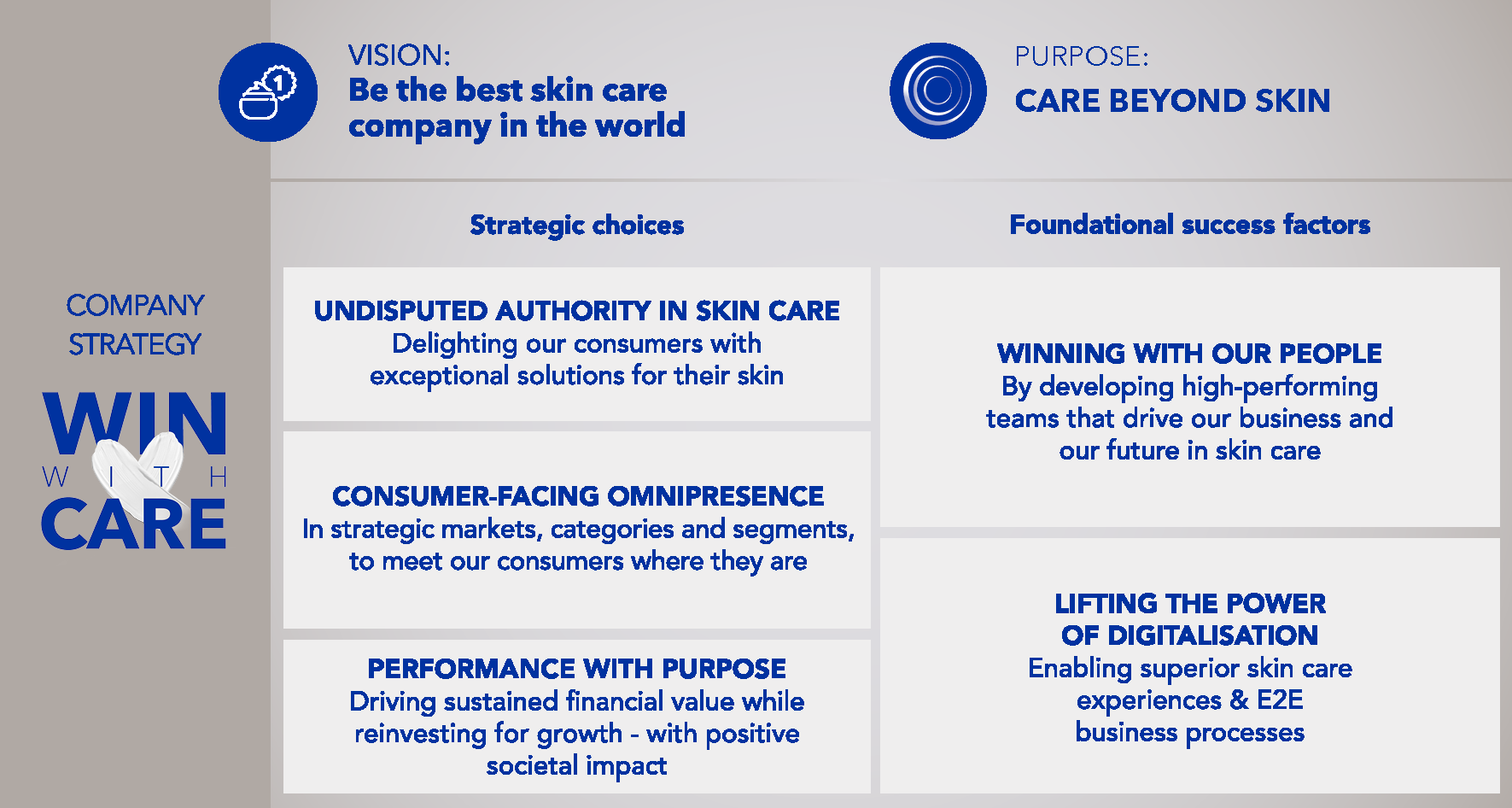The “Win with Care” strategy is based on the following strategic decisions, with the underlying success factors delivered though the “Care Beyond Skin” corporate purpose: