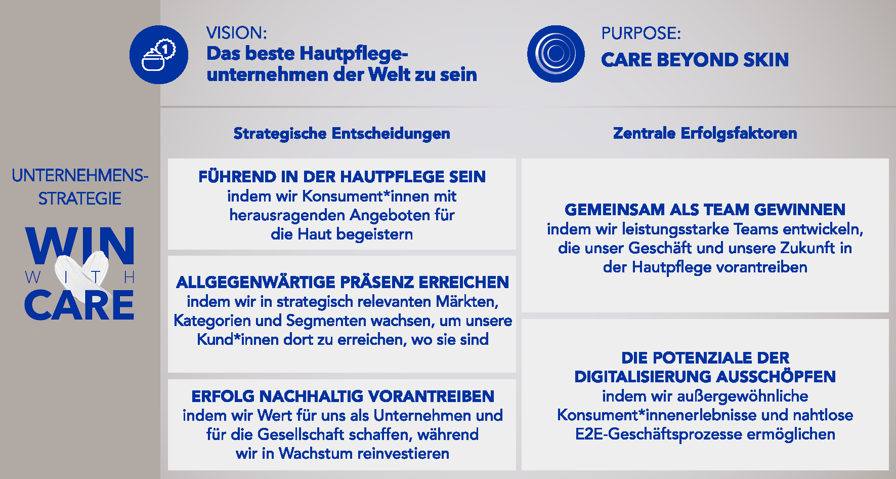 Die „Win with Care“-Strategie basiert auf folgenden strategischen Entscheidungen; der Unternehmenszweck „Care Beyond Skin“ bildet dabei grundlegende Erfolgsfaktoren: